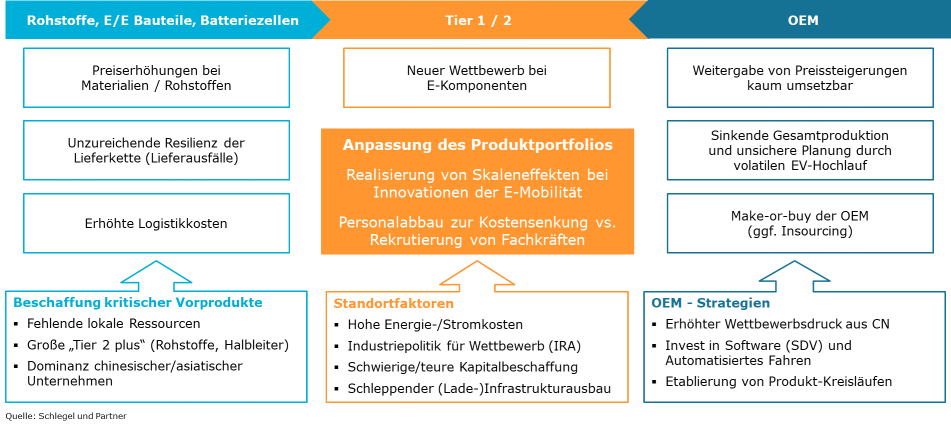 Die Lage der europäischen Automobilindustrie ist herausfordernd. In besonderem Maße stehen Zulieferer vor wichtigen Entscheidungen, um ihr Geschäft in schwierigen wirtschaftlichen Zeiten im Rahmen der Branchentransformation erfolgreich zu gestalten. Wir blicken auf mögliche Handlungsfelder und die drängendsten Fragen der Branche, so wie wir sie bei Schlegel und Partner aktuell erleben.