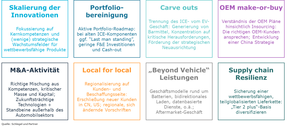 Wesentliche Führungsaufgabe ist es, das gewinnbringende bestehende Geschäft weiter zur Kundenzufriedenheit zu betreiben und dabei die eigenen Ressourcen so zu allokieren, dass neue (häufig noch nicht wirklich profitable) strategische Geschäftsbereiche erfolgreich auf die Straße gebracht werden können.Kunden von Schlegel und Partner beschäftigen sich neben typischen strategischen Themen bezüglich Technologie, Leistungsversprechen und Zielmarkt nunmehr verstärkt mit Lösungsansätzen, die auf kurz- bis mittelfristige Wirkung abzielen.Aktuell sind möglichst schnell umsetzbare Lösungen gefragt.Verkürzte, agile und fokussierte Entwicklungsprozesse und Digitalisierung der Produktion können bei der Kostenreduktion helfen. Daneben existieren mehrere Handlungsfelder mit denen sich Zulieferer sinnvollerweise auseinandersetzen.